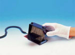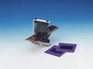 Das Filmreinigungsgerät wird am Filmprojektor, der Filmtellereinrichtung oder dem Spulenturm im Filmweg montiert und hält die Filmkopie bei jedem Durchlauf sauber. Der Film wird hierzu über Filmreinigungsbänder geführt, die sich automatisch langsam weiterbewegen. Dadurch wird verhindert, daß sich in den Bändern ansammelnder Staub und Schmutz über den Film gezogen wird. |