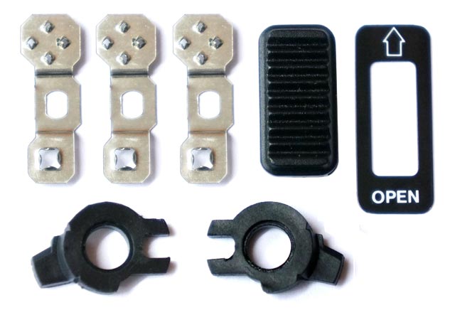 1 Set bestehend aus: 3 Stck. Kontaktfeder, 2 Stck. seitliche Verschlussriegel, 1 Stck. Schieber, 1 Stck. Beschriftung.